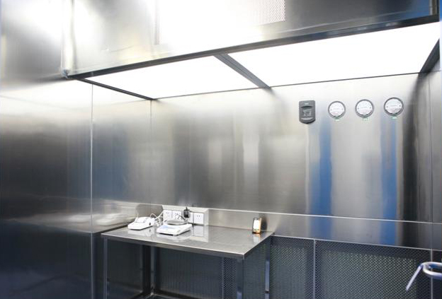 ③送風(fēng)口裝有高數(shù)過濾器,保證空氣潔凈度達(dá)到要求;高效出風(fēng)面的下端設(shè)有均流膜,確保A級區(qū)域面風(fēng)速均勻;