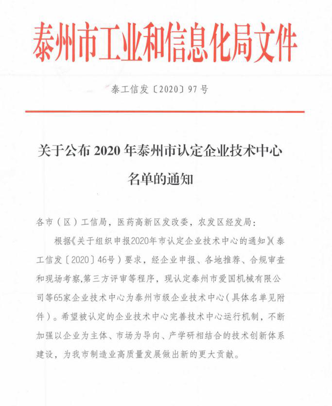 接泰州市工信局文件通知,經(jīng)企業(yè)申報(bào)、各地推薦、合規(guī)審查和現(xiàn)場(chǎng)考察,第三方評(píng)定等相關(guān)程序,公布認(rèn)定2020年泰州市企業(yè)技術(shù)中心名單。江蘇捷順機(jī)電設(shè)備有限公司通過(guò)審核認(rèn)定,位列其中。
